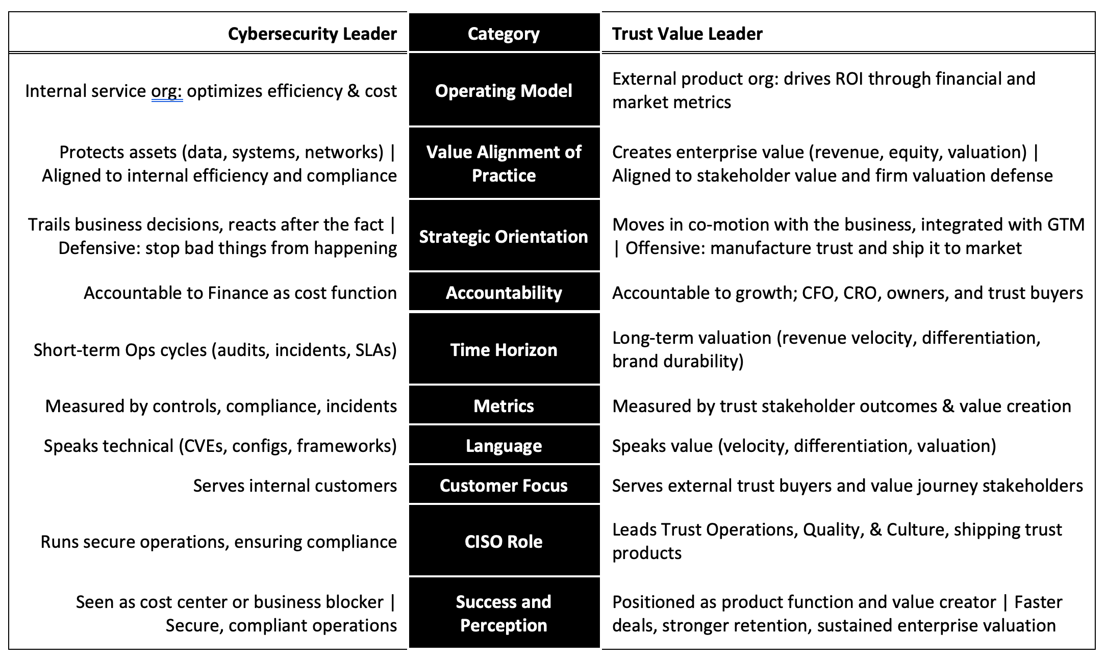 The role of enterprise security leadership is undergoing a structural shift. The traditional cybersecurity leader operates an internal service organization, focused on protecting assets, ensuring compliance, and optimizing efficiency. Their performance is measured in the absence of incidents and the containment of cost. While necessary, this service model caps security at the level of overhead. By contrast, the trust value leader operates as a product organization. Their mandate is to manufacture, measure, and deliver trust as a market-facing asset that accelerates revenue, defends valuation, and differentiates the enterprise in competitive environments.