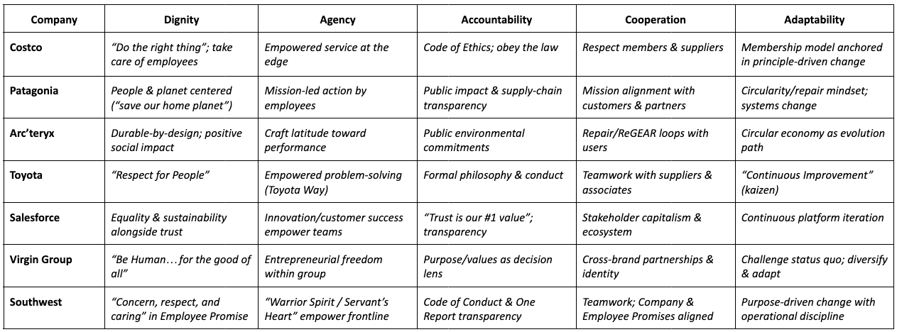 Patagonia exemplifies intentional trust-building. Dignity is expressed through environmental stewardship, treating the planet as a stakeholder. Agency is visible in employees encouraged to engage in activism. Accountability is enforced through transparent reporting on supply chains and environmental impact.