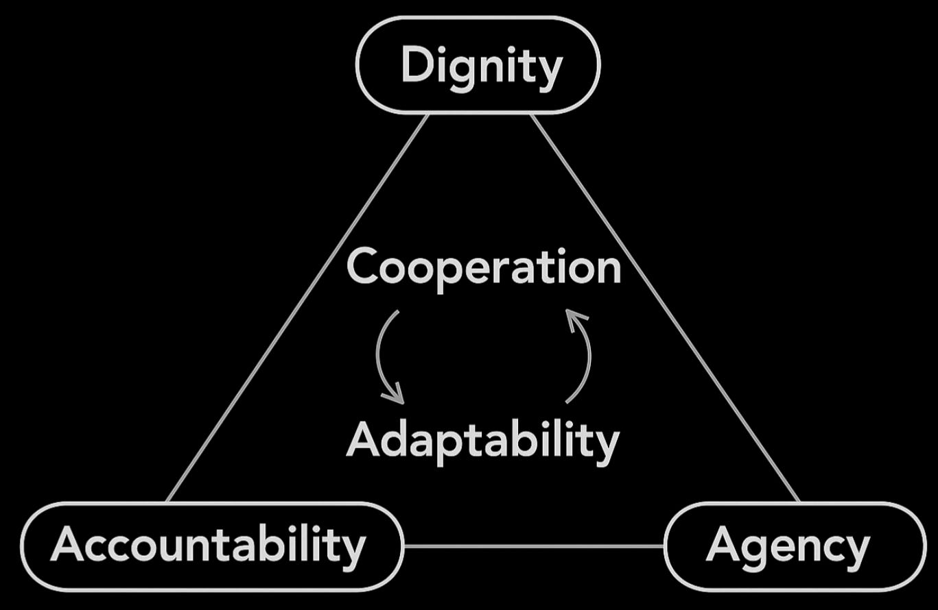 Below this paragraph stands a figure: a pyramid with three vertices labeled dignity, agency, and accountability, and in the center a self-reinforcing loop between cooperation and adaptability. What appears at first glance to be a visual simplification is in fact the compression of a predictive model of human thriving, an instrument as precise as a compass or gyroscope. This pyramid is a universal algorithm for diagnosing the conditions under which humans survive and flourish, from the scale of two individuals to two billion.